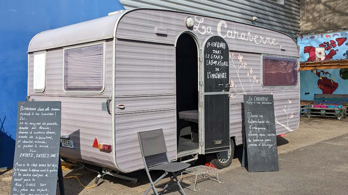 La Caraverne est une caravane aménagée pour accueillir 16 personnes, enfants comme adultes. Ce lieu mobile s’adapte à tous les projets et s’implante facilement dans tous types d’espaces pour aller à la rencontre de divers publics.
