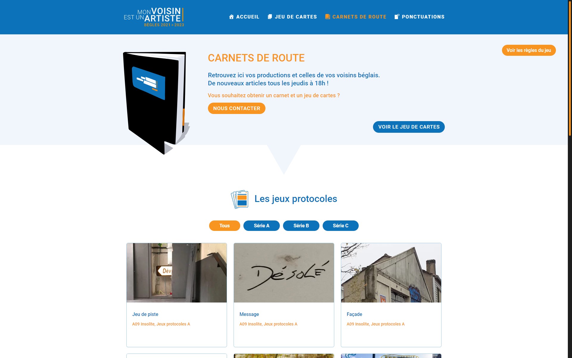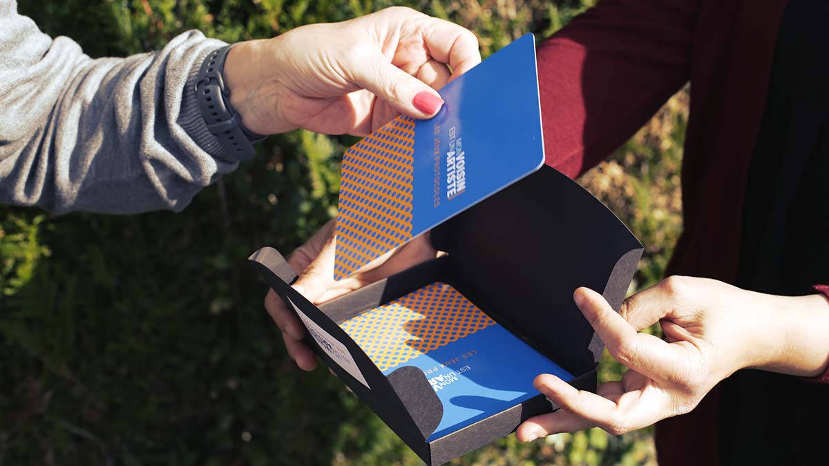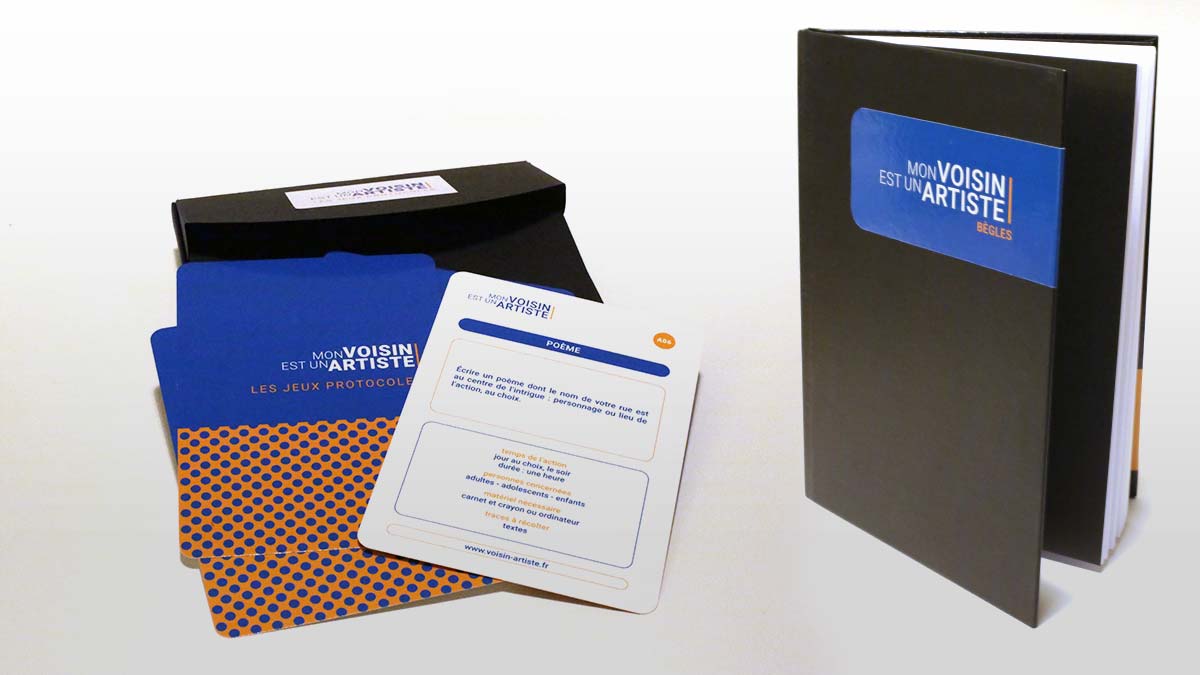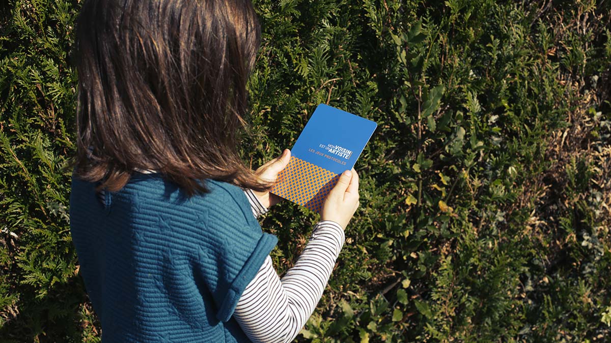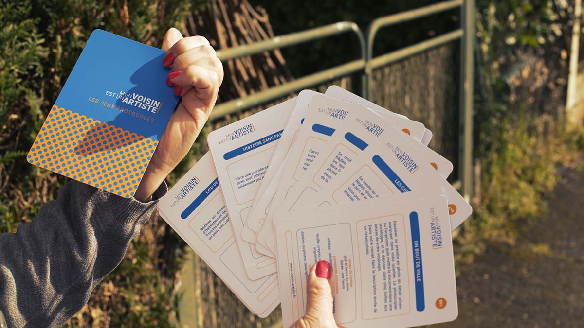 Mon voisin est un artiste propose de vivre une expérience de voisinages créatifs grâce à un jeu de cartes conçu par l’artiste plasticien Guillaume Hillairet, co-directeur artistique du projet. Un jeu pour explorer son quartier et aller à la rencontre de ses voisins proches ou lointains. Les cartes présentent des actions à réaliser en suivant des règles simples et précises : les jeux protocoles. Ils favorisent des expériences créatives pour transformer le quotidien. Textes, photos, dessins et l’ensemble des productions réalisées composent progressivement un atlas de nos arts du voisinage, visible sur le site voisin-artiste.fr.